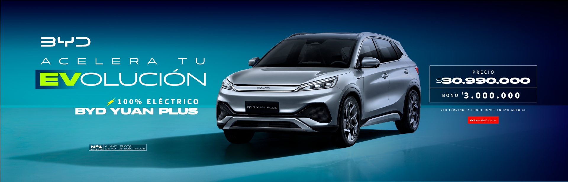 “Campaña BYD AUTO 50/50 Tasa especial agosto 2025” válida por compras realizadas entre el 01 y el 31 de octubre de 2025 y financiadas mediante crédito otorgado por Santander Consumer Finance Ltda. Precio corresponde a Modelo BYD Yuan Plus. Precio sin bono: $32.990.000. Precio $30.990.000 incluye bono marca y bono financiamiento Santander Consumer. Condiciones de Financiamiento: Pie del 50% y plazo de 25 meses, con producto Black 50/50 Santander Consumer, línea Black, VFMG (Cuota 25 de 50% del valor del vehículo). Valores no incluyen seguros, los seguros son optativos La aprobación, las condiciones y el otorgamiento del financiamiento están sujetos a la evaluación comercial conforme a las políticas de Santander Consumer Finance Ltda. La disponibilidad y proceso de compra de vehículos son de exclusiva responsabilidad de la marca y su red de concesionarios, no cabiéndole a Santander Consumer Finance Ltda. Intervención alguna en ello ni en la ulterior responsabilidad que ello pudiere generar. Infórmese de la garantía estatal de los depósitos en su banco o en www.cmfchile.cl.