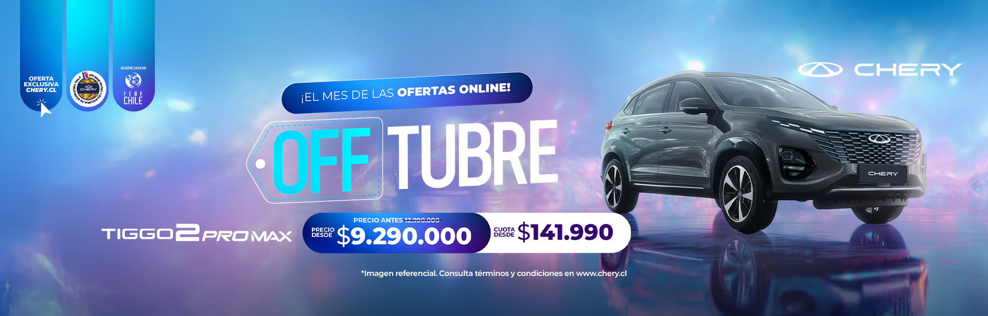 TIGGO 2 PRO MAX GL MT Valor $9.290.000 incluye bono marca con todo medio de pago de $1.000.000; Bono Online, $700.000 y bono con financiamiento Santander Consumer de $2.000.000, precio sin bonos $12.990.000. Promoción válida por compras realizadas entre el 26 de Septiembre hasta el 12 de Octubre del 2025 y financiadas mediante crédito otorgado por Santander Consumer Finance Ltda. Condiciones de Financiamiento: Pie máximo 50% y plazo de 25/37 meses, con producto Compra Inteligente 30% de Santander Consumer, línea Prime, VFMG (Cuota 25/37 de 30% del valor del vehículo). Valores no incluyen seguros que son optativos. La aprobación, las condiciones y el otorgamiento del financiamiento están sujetos a la evaluación comercial conforme a las políticas de Santander Consumer Finance Ltda.