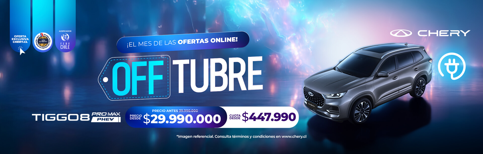 TIGGO 8 PRO MAX DHT PHEV: Valor $29.990.000 incluye bono marca con todo medio de pago de $2.000.000; Bono Online, $6.000.000 y bono con financiamiento Santander Consumer de $2.000.000, precio sin bonos $39.990.000. Promoción válida por compras realizadas entre el 26 de Septiembre hasta el 12 de Octubre del 2025 y financiadas mediante crédito otorgado por Santander Consumer Finance Ltda. Condiciones de Financiamiento: Pie máximo 50% y plazo de 25/37 meses, con producto Compra Inteligente 30% de Santander Consumer, línea Prime, VFMG (Cuota 25/37 de 30% del valor del vehículo). Valores no incluyen seguros que son optativos. La aprobación, las condiciones y el otorgamiento del financiamiento están sujetos a la evaluación comercial conforme a las políticas de Santander Consumer Finance Ltda.