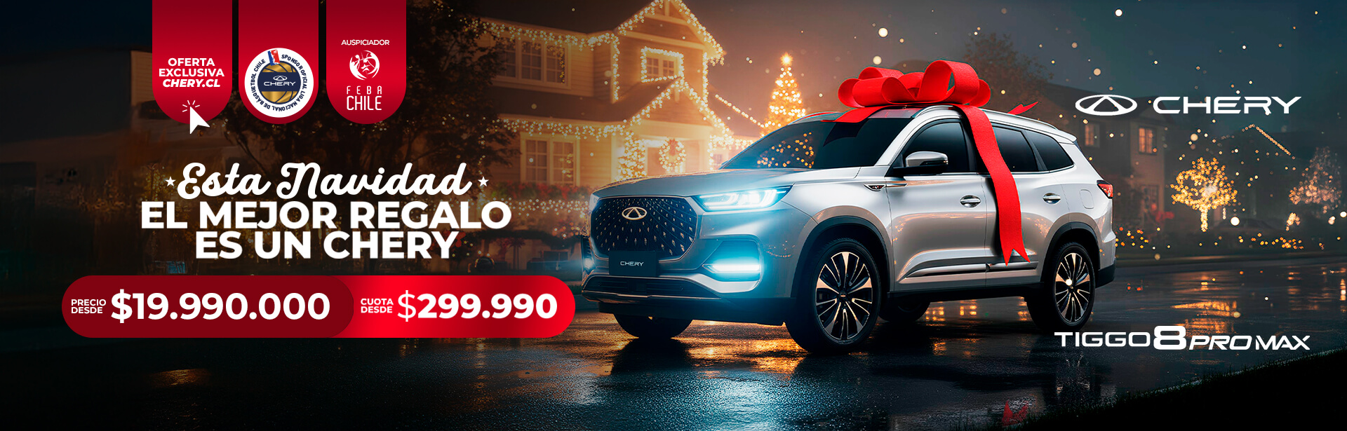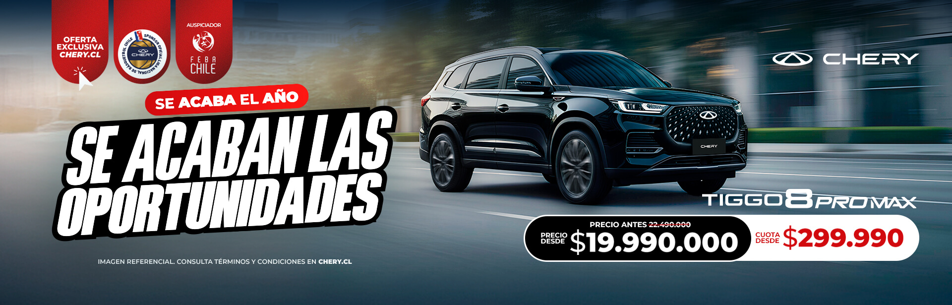 TIGGO 8 PRO MAX GLX DCT: Valor $22.490.000 incluye bono marca con todo medio de pago de $1.500.000; Bono Online, $1.000.000 y bono con financiamiento Santander Consumer de $1.500.000, precio sin bonos $26.490.000. Promoción válida por compras realizadas entre el 26 de Septiembre hasta el 12 de Octubre del 2025 y financiadas mediante crédito otorgado por Santander Consumer Finance Ltda. Condiciones de Financiamiento: Pie máximo 50% y plazo de 25/37 meses, con producto Compra Inteligente 30% de Santander Consumer, línea Prime, VFMG (Cuota 25/37 de 30% del valor del vehículo). Valores no incluyen seguros que son optativos. La aprobación, las condiciones y el otorgamiento del financiamiento están sujetos a la evaluación comercial conforme a las políticas de Santander Consumer Finance Ltda.