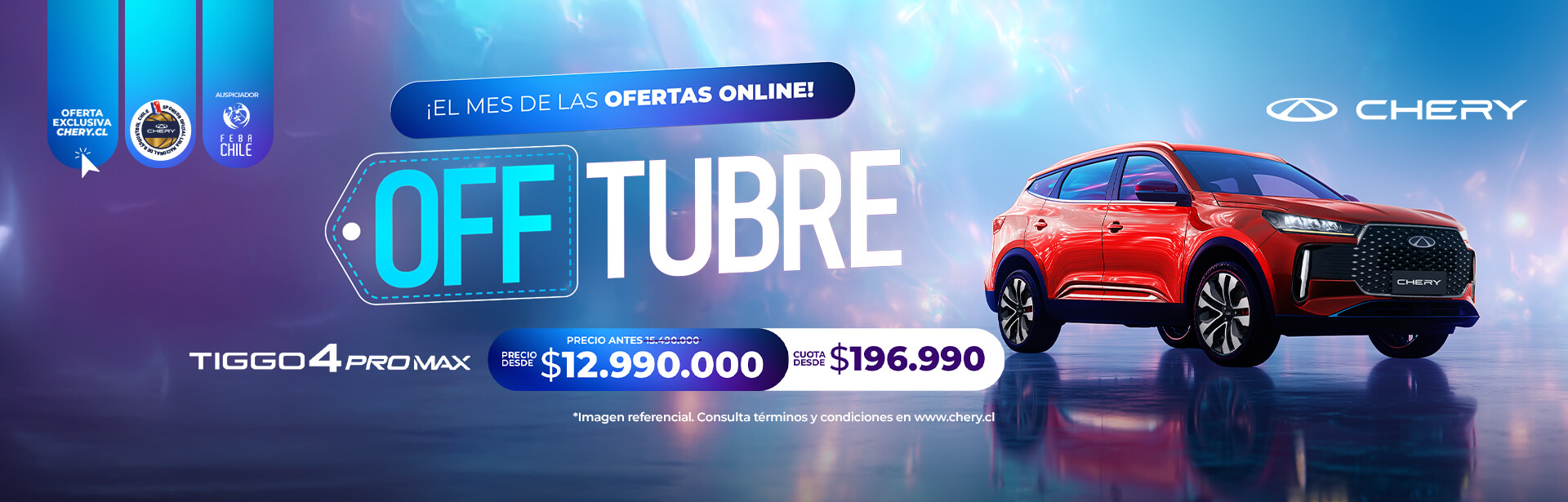 TIGGO 4 PRO MAX NEW (Euro6C): Valor $12.990.000 incluye bono marca con todo medio de pago de $1.000.000; Bono Online, $500.000 y bono con financiamiento Santander Consumer de $1.000.000, precio sin bonos $15.490.000. Promoción válida por compras realizadas entre el 26 de Septiembre hasta el 12 de Octubre del 2025 y financiadas mediante crédito otorgado por Santander Consumer Finance Ltda. Condiciones de Financiamiento: Pie máximo 50% y plazo de 25/37 meses, con producto Compra Inteligente 30% de Santander Consumer, línea Prime, VFMG (Cuota 25/37 de 30% del valor del vehículo). Valores no incluyen seguros que son optativos. La aprobación, las condiciones y el otorgamiento del financiamiento están sujetos a la evaluación comercial conforme a las políticas de Santander Consumer Finance Ltda.