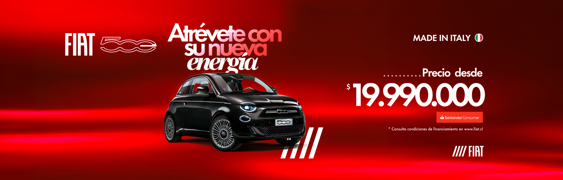 Promoción válida por compras realizadas desde el 01 al 31 de Octubre 2025 o hasta agotar stock de 40 unidades, y financiadas mediante crédito otorgado por Santander Consumer Finance Ltda. Precio corresponde a Modelo 500e. Precio lista: $26.990.000. Precio: $19.990.000. Incluye bono todo medio de pago de $5.000.000 y bono con financiamiento Santander Consumer C.I. de $2.000.000. Condiciones de Financiamiento: Producto Compra Inteligente con pie máximo de 50% a plazos de 24 y 36 meses más VFMG (Cuota mes 25 y 37 respectivamente). Valores no incluyen seguros que son optativos. Crédito sujeto a aprobación, previa evaluación de antecedentes comerciales conforme a las políticas de Santander Consumer Finance Ltda. Crédito sujeto a aprobación, previa evaluación de antecedentes comerciales conforme a las políticas de Santander Consumer Finance Ltda. Precio excluye Zona Franca y no incluye flete a regiones. Ejemplo Simulación cuota: modelo FIAT 500E. Precio con bono $19.990.000, Pie $16.059.050, CAE 24% CTC de $14.794.760, 24 cuotas de $199.990 más un VFMG (Cuota 25) de $9.995.000. Tasa 1,79%. Valores no incluyen seguros, los seguros son optativos.