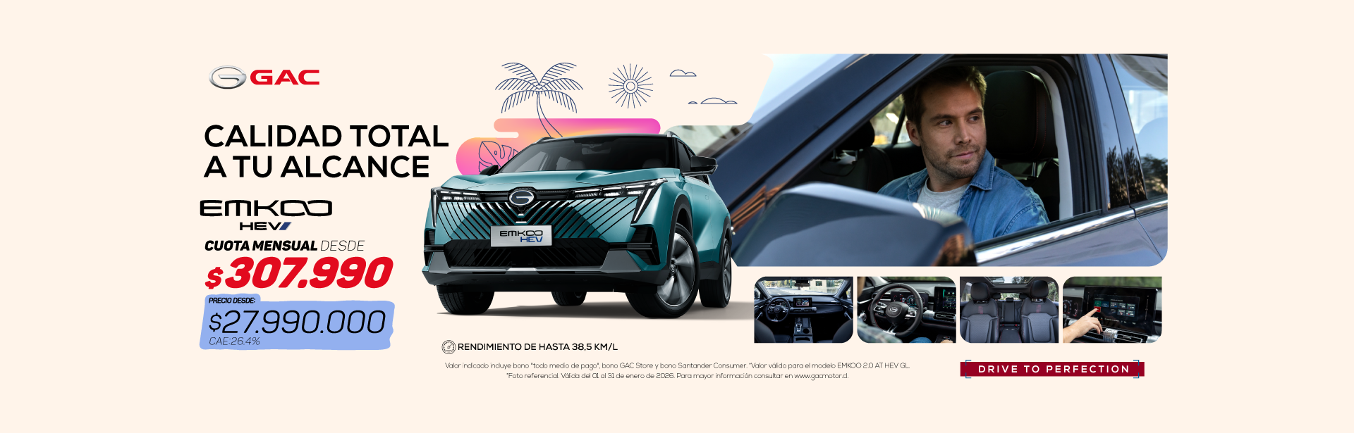 “Campaña GAC 50/50 noviembre 2025” válida por compras realizadas entre el 01 y el 30 de noviembre de 2025 y financiadas mediante crédito otorgado por Santander Consumer Finance Ltda. Precio corresponde a Modelo EMKOO 2.0 AT HEV GL Precio sin bono: $28.990.000. Precio $27.990.000 incluye bonos marca, GAC Store y bono financiamiento Santander Consumer. Condiciones de Financiamiento: Pie del 50% y plazo de 25 meses, con producto Black 50/50 Santander Consumer, línea Silver, VFMG (Cuota 25 de 50% del valor del vehículo) Ejemplo Simulación: modelo EMKOO 2.0 AT HEV GL Precio con bono $27.990.000, Pie $13.995.000, CAE 26,4%, CTC de $21.386.760, 24 cuotas de $307.990 más un VFMG (Cuota 25) de $13.995.000. Valores no incluyen seguros, los seguros son optativos. La aprobación, las condiciones y el otorgamiento del financiamiento están sujetos a la evaluación comercial conforme a las políticas de Santander Consumer Finance Ltda. La disponibilidad y proceso de compra de vehículos son de exclusiva responsabilidad de la marca y su red de concesionarios, no cabiéndole a Santander Consumer Finance Ltda. Intervención alguna en ello ni en la ulterior responsabilidad que ello pudiere generar. Infórmese de la garantía estatal de los depósitos en su banco o en www.cmfchile.cl