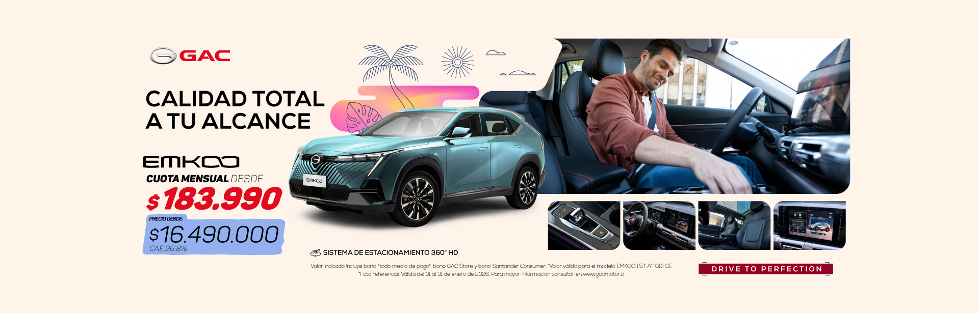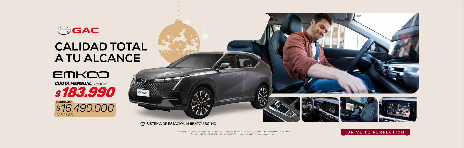 “Campaña GAC 50/50 noviembre 2025” válida por compras realizadas entre el 01 y el 30 de noviembre de 2025 y financiadas mediante crédito otorgado por Santander Consumer Finance Ltda. Precio corresponde a Modelo EMKOO 1.5T AT GDI GE Precio sin bono: $18.490.000. Precio $16.490.000 incluye bonos marca, GAC Store y bono financiamiento Santander Consumer. Condiciones de Financiamiento: Pie del 50% y plazo de 25 meses, con producto Black 50/50 Santander Consumer, línea Silver, VFMG (Cuota 25 de 50% del valor del vehículo) Ejemplo Simulación: modelo EMKOO 1.5T AT GDI GE Precio con bono $16.490.000, Pie $8.245.000, CAE 26,8%, CTC de $12.660.760, 24 cuotas de $183.990 más un VFMG (Cuota 25) de $8.245.000. Valores no incluyen seguros, los seguros son optativos. “Campaña GAC 50/50 noviembre 2025” válida por compras realizadas entre el 01 y el 30 de noviembre de 2025 y financiadas mediante crédito otorgado por Santander Consumer Finance Ltda. Precio corresponde a Modelo EMKOO 1.5T AT GDI GL Precio sin bono: $21.990.000. Precio $19.990.000 incluye bonos marca, GAC Store y bono financiamiento Santander Consumer. Condiciones de Financiamiento: Pie del 50% y plazo de 25 meses, con producto Black 50/50 Santander Consumer, línea Silver, VFMG (Cuota 25 de 50% del valor del vehículo) Ejemplo Simulación: modelo EMKOO 1.5T AT GDI GL Precio con bono $19.990.000, Pie $9.995.000, CAE 26,7%, CTC de $15.322.760, 24 cuotas de $221.990 más un VFMG (Cuota 25) de $9.995.000. Valores no incluyen seguros, los seguros son optativos. La aprobación, las condiciones y el otorgamiento del financiamiento están sujetos a la evaluación comercial conforme a las políticas de Santander Consumer Finance Ltda. La disponibilidad y proceso de compra de vehículos son de exclusiva responsabilidad de la marca y su red de concesionarios, no cabiéndole a Santander Consumer Finance Ltda. Intervención alguna en ello ni en la ulterior responsabilidad que ello pudiere generar. Infórmese de la garantía estatal de los depósitos en su banco o en www.cmfchile.cl