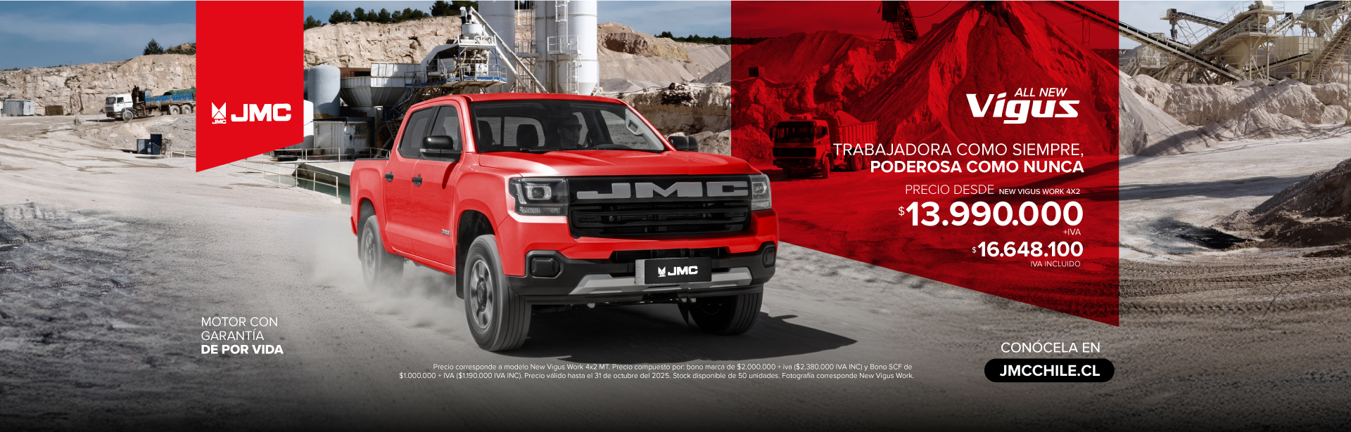 VIGUS PLUS 4X2 EURO 6CPromoción válida por compras realizadas del 1 hasta el 31 de octubre de 2025 y financiadas por Santander Consumer Finance Ltda. Precio corresponde a Modelo Vigus Plus 4×2. Precio sin bono: $22.598.100 IVA INC. Precio con bono Compra Credito Santander Consumer y Bono marca: $19.028.100 IVA INC. Condiciones de Financiamiento: pie máximo de 50% y plazo mínimo de 24 meses con los productos Compra Inteligente línea normal. Seguros son optativos. Crédito sujeto a aprobación, previa evaluación de antecedentes comerciales conforme a las políticas de Santander Consumer Finance Ltda. “Campaña JMC Tasa especial octubre 2025”, promoción válida por compras realizadas del 1 hasta el 31 de octubre de 2025 y financiadas mediante crédito otorgado por Santander Consumer Finance Ltda. Y hasta agotar stock de unidades destinadas a la campaña. Condiciones de Financiamiento: Pie máximo del 50%, plazo mínimo 24 meses, con productos Compra Inteligente de Santander Consumer en línea Silver. CAE 26,7% calculado a 24 meses con 50% de pie inicial y con 50% VFMG (Cuota 25). Valores no incluyen seguros que son optativos. La aprobación, las condiciones y el otorgamiento del financiamiento están sujetos a la evaluación comercial conforme a las políticas de Santander Consumer Finance Ltda. La disponibilidad y proceso de compra de vehículos son de exclusiva responsabilidad de la marca y su red de concesionarios, no cabiéndole a Santander Consumer Finance Ltda. Intervención alguna en ello ni en la ulterior responsabilidad que ello pudiere generar. Infórmese de la garantía estatal de los depósitos en su banco o en www.cmfchile.cl.Campaña JMC 50/50 octubre 2025” válida por compras realizadas del 1 hasta el 31 de octubre de 2025 y financiadas mediante crédito otorgado por Santander Consumer Finance Ltda. Precio corresponde a Modelo New Vigus Plus 4×2 Euro 6. Precio sin bono: $22.598.100. Precio $19.028.100 incluye bono marca y bono financiamiento Santander Consumer. Condiciones de Financiamiento: Pie del 50% y plazo de 25 meses, con producto Black 50/50 Santander Consumer, línea Silver, VFMG (Cuota 25 de 50% del valor del vehículo) Ejemplo Simulación: modelo New Vigus Plus 4×2 Euro 6 Precio con bono $19.028.100, Pie $9.514.050, CAE 26,7%, CTC de $14.601.810, 24 cuotas de $211.990 más un VFMG (Cuota 25) de $9.514.050. Valores no incluyen seguros, los seguros son optativos.