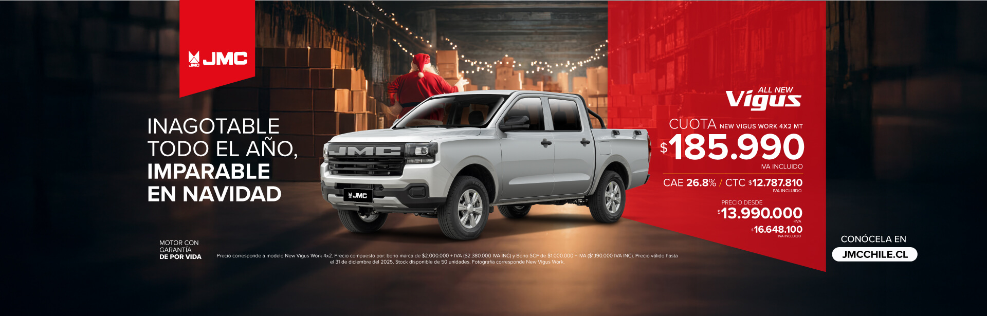 NEW VIGUS WORK 4X2Promoción válida por compras realizadas del 1 hasta el 31 de diciembre de 2025 y financiadas por Santander Consumer Finance Ltda. Precio corresponde a Modelo New Vigus Work 4×2. Precio sin bono: $20.218.100 IVA INC. Precio con bono Compra Credito Santander Consumer y Bono marca: $16.648.100 IVA INC. Condiciones de Financiamiento: pie máximo de 50% y plazo mínimo de 24 meses con los productos Compra Inteligente línea normal. Seguros son optativos. Crédito sujeto a aprobación, previa evaluación de antecedentes comerciales conforme a las políticas de Santander Consumer Finance Ltda. “Campaña JMC Tasa especial diciembre 2025”, promoción válida por compras realizadas del 1 hasta el 31 de diciembre de 2025 y financiadas mediante crédito otorgado por Santander Consumer Finance Ltda. y hasta agotar stock de unidades destinadas a la campaña. Condiciones de Financiamiento: Pie máximo del 50%, plazo mínimo 24 meses, con productos Compra Inteligente de Santander Consumer en línea Silver. CAE 26,8% calculado a 24 meses con 50% de pie inicial y con 50% VFMG (Cuota 25). Valores no incluyen seguros que son optativos. La aprobación, las condiciones y el otorgamiento del financiamiento están sujetos a la evaluación comercial conforme a las políticas de Santander Consumer Finance Ltda La disponibilidad y proceso de compra de vehículos son de exclusiva responsabilidad de la marca y su red de concesionarios, no cabiéndole a Santander Consumer Finance Ltda. Intervención alguna en ello ni en la ulterior responsabilidad que ello pudiere generar. Infórmese de la garantía estatal de los depósitos en su banco o en www.cmfchile.cl.Campaña JMC 50/50 diciembre 2025” válida por compras realizadas del 1 hasta el 31 de diciembre de 2025 y financiadas mediante crédito otorgado por Santander Consumer Finance Ltda. Precio corresponde a Modelo New Vigus work 4×2 Precio sin bono: $20.218.100 Precio $16.648.100 incluye bono marca y bono financiamiento Santander Consumer. Condiciones de Financiamiento: Pie del 50% y plazo de 25 meses, con producto Black 50/50 Santander Consumer, línea Silver, VFMG (Cuota 25 de 50% del valor del vehículo) Ejemplo Simulación: modelo New Vigus Work 4×2. Precio con bono $16.648.100, Pie $8.324.050, CAE 26,8%, CTC de $12.787.810, 24 cuotas de $185.990 más un VFMG (Cuota 25) de $8.324.050. Valores no incluyen seguros, los seguros son optativos.