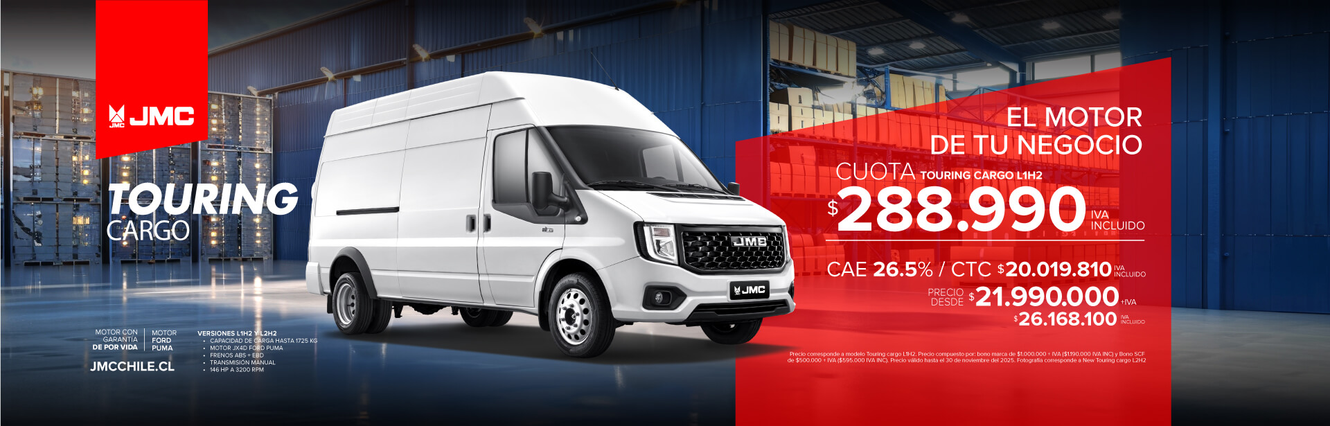 TOURING CARGO L1H2Promoción válida por compras realizadas del 1 hasta el 31 de diciembre de 2025 y financiadas por Santander Consumer Finance Ltda. Precio corresponde a Modelo Touring Cargo L1H2. Precio sin bono: $27.953.100 IVA INC. Precio con bono Compra Credito Santander Consumer y Bono marca: $26.168.100 IVA INC. Condiciones de Financiamiento: pie máximo de 50% y plazo mínimo de 24 meses con los productos Compra Inteligente línea normal. Seguros son optativos. Crédito sujeto a aprobación, previa evaluación de antecedentes comerciales conforme a las políticas de Santander Consumer Finance Ltda.“Campaña JMC Tasa especial diciembre 2025”, promoción válida por compras realizadas del 1 hasta el 31 de diciembre de 2025 y financiadas mediante crédito otorgado por Santander Consumer Finance Ltda. y hasta agotar stock de unidades destinadas a la campaña. Condiciones de Financiamiento: Pie máximo del 50%, plazo mínimo 24 meses, con productos Compra Inteligente de Santander Consumer en línea Silver. CAE 26,5% calculado a 24 meses con 50% de pie inicial y con 50% VFMG (Cuota 25). Valores no incluyen seguros que son optativos. La aprobación, las condiciones y el otorgamiento del financiamiento están sujetos a la evaluación comercial conforme a las políticas de Santander Consumer Finance Ltda. La disponibilidad y proceso de compra de vehículos son de exclusiva responsabilidad de la marca y su red de concesionarios, no cabiéndole a Santander Consumer Finance Ltda. Intervención alguna en ello ni en la ulterior responsabilidad que ello pudiere generar. Infórmese de la garantía estatal de los depósitos en su banco o en www.cmfchile.cl.Campaña JMC 50/50 diciembre 2025” válida por compras realizadas del 1 hasta el 31 de diciembre de 2025 y financiadas mediante crédito otorgado por Santander Consumer Finance Ltda. Precio corresponde a Touring Cargo L1H2. Precio sin bono: $27.953.100. Precio $26.168.100, incluye financiamiento Santander Consumer y bono marca. Condiciones de Financiamiento: Pie del 50% y plazo de 25 meses, con producto Black 50/50 Santander Consumer, línea Silver, VFMG (Cuota 25 de 50% del valor del vehículo) Ejemplo Simulación: modelo Touring Cargo L1H2. Precio con bono $26.168.100, Pie $13.084.050, CAE 26,5%, CTC de $20.019.810, 24 cuotas de $288.990 más un VFMG (Cuota 25) de $13.084.050. Valores no incluyen seguros, los seguros son optativos.