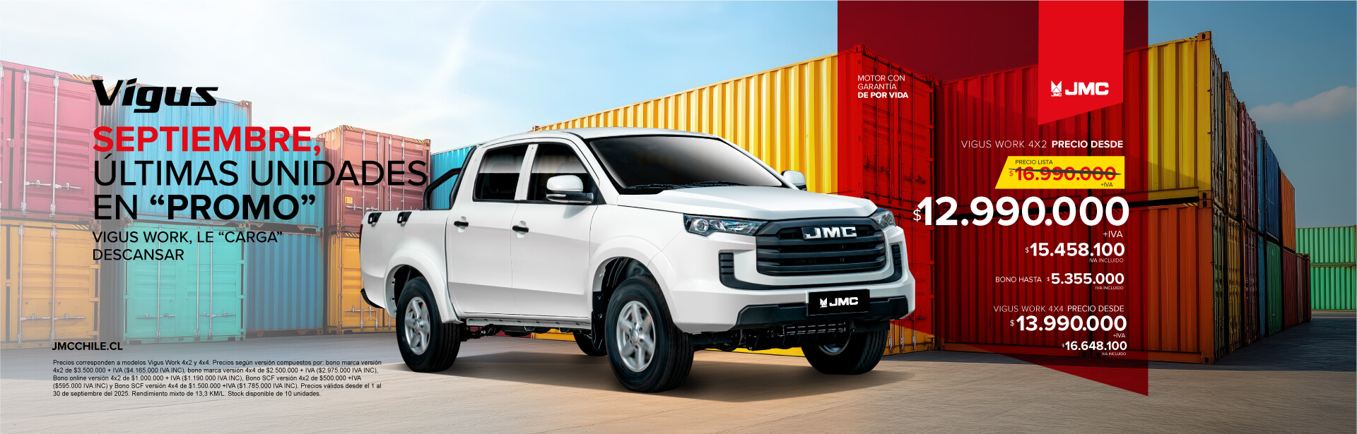 VIGUS WORK 4X4 EURO 6CPromoción válida por compras realizadas del 1 hasta el 31 de octubre de 2025 y financiadas por Santander Consumer Finance Ltda. Precio corresponde a Modelo Vigus work 4×4. Precio sin bono: $21.408.100 IVA INC. Precio con bono Compra Credito Santander Consumer y Bono marca: $17.243.100 IVA INC. Condiciones de Financiamiento: pie máximo de 50% y plazo mínimo de 24 meses con los productos Compra Inteligente línea normal. Seguros son optativos. Crédito sujeto a aprobación, previa evaluación de antecedentes comerciales conforme a las políticas de Santander Consumer Finance Ltda. “Campaña JMC Tasa especial octubre 2025” promoción válida por compras realizadas del 1 hasta el 31 de octubre de 2025 y financiadas mediante crédito otorgado por Santander Consumer Finance Ltda. y hasta agotar stock de unidades destinadas a la campaña. Condiciones de Financiamiento: Pie máximo del 50%, plazo mínimo 24 meses, con productos Compra Inteligente de Santander Consumer en línea Silver. CAE 26,9% calculado a 24 meses con 50% de pie inicial y con 50% VFMG (Cuota 25). Valores no incluyen seguros que son optativos. La aprobación, las condiciones y el otorgamiento del financiamiento están sujetos a la evaluación comercial conforme a las políticas de Santander Consumer Finance Ltda. La disponibilidad y proceso de compra de vehículos son de exclusiva responsabilidad de la marca y su red de concesionarios, no cabiéndole a Santander Consumer Finance Ltda. Intervención alguna en ello ni en la ulterior responsabilidad que ello pudiere generar. Infórmese de la garantía estatal de los depósitos en su banco o en www.cmfchile.cl.Campaña JMC 50/50 octubre 2025” válida por compras realizadas del 1 hasta el 31 de octubre de 2025 y financiadas mediante crédito otorgado por Santander Consumer Finance Ltda. Precio corresponde a Modelo New Vigus Work 4×4 Euro 6. Precio sin bono: $21.408.100. Precio $17.243.100 incluye bono marca y bono financiamiento Santander Consumer. Condiciones de Financiamiento: Pie del 50% y plazo de 25 meses, con producto Black 50/50 Santander Consumer, línea Silver, VFMG (Cuota 25 de 50% del valor del vehículo) Ejemplo Simulación: modelo New Vigus Work 4×4 Euro 6. Precio con bonos $17.243.100, Pie $8.621.550, CAE 26,9%, CTC de $13.253.310, 24 cuotas de $192.990 más un VFMG (Cuota 25) de $8.621.550. Valores no incluyen seguros, los seguros son optativos.