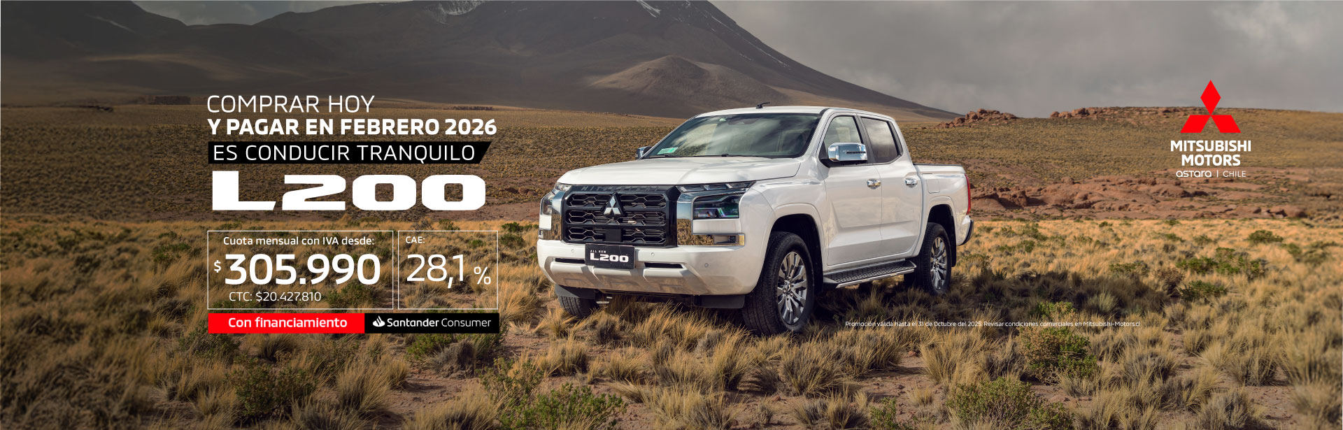 “Campaña Mitsubishi CI 50/50 tasa 1.99 octubre 2025” válida por compras realizadas entre el 01 y el 08 de octubre de 2025 y financiadas mediante crédito otorgado por Santander Consumer Finance Ltda. Precio corresponde a Modelo L200 DAKAR XR AT GLS PLUS ( EURO 6C)Precio sin bono: $43.490.000. Precio $39.490.000 incluye bono marca y bono financiamiento Santander Consumer. Condiciones de Financiamiento: Pie del 50% y plazo de 25 meses, con producto Black 50/50 Santander Consumer, línea Silver, VFMG (Cuota 25 de 50% del valor del vehículo) Ejemplo Simulación: modelo L200 DAKAR XR AT GLS PLUS ( EURO 6C) Precio con bono $39.490.000, Pie $23.496.550, CAE 27,8%, CTC de $36.552.310, 24 cuotas de $543.990 más un VFMG (Cuota 25) de $23.496.550. Valores incluyen gastos operacionales y seguro de desgravamen, los seguros son optativos.