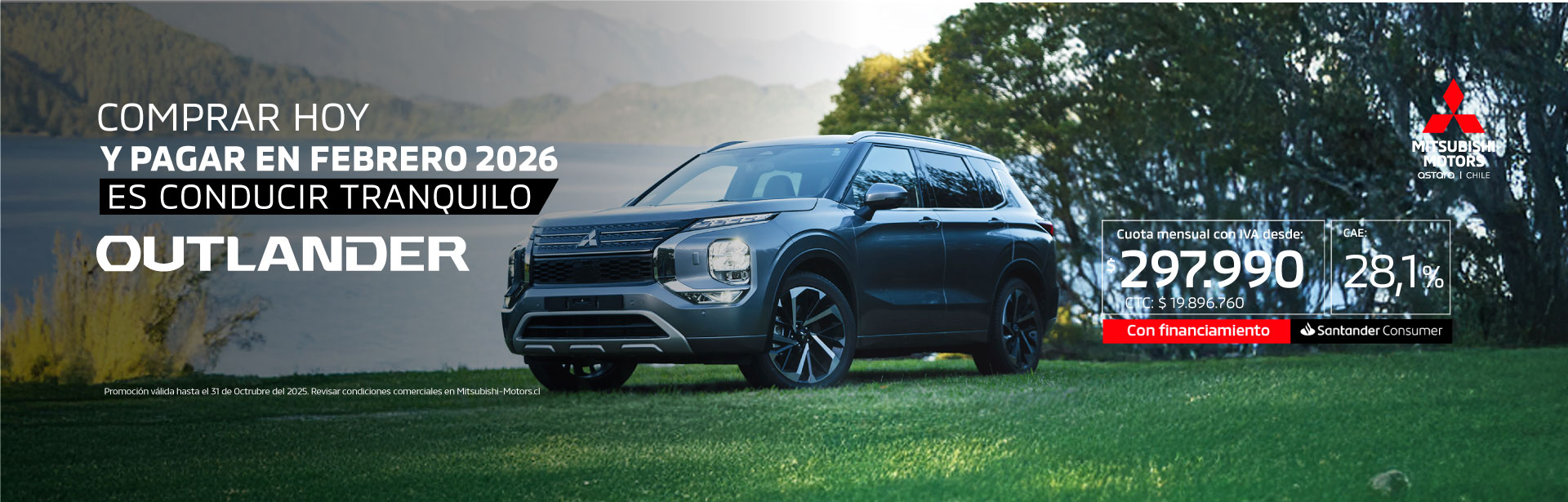 “Campaña Mitsubishi CI 50/50 tasa 1.99 octubre 2025” válida por compras realizadas entre el 01 y el 08 de octubre de 2025 y financiadas mediante crédito otorgado por Santander Consumer Finance Ltda. Precio corresponde a Modelo OUTLANDER AT GL (EURO 6B)