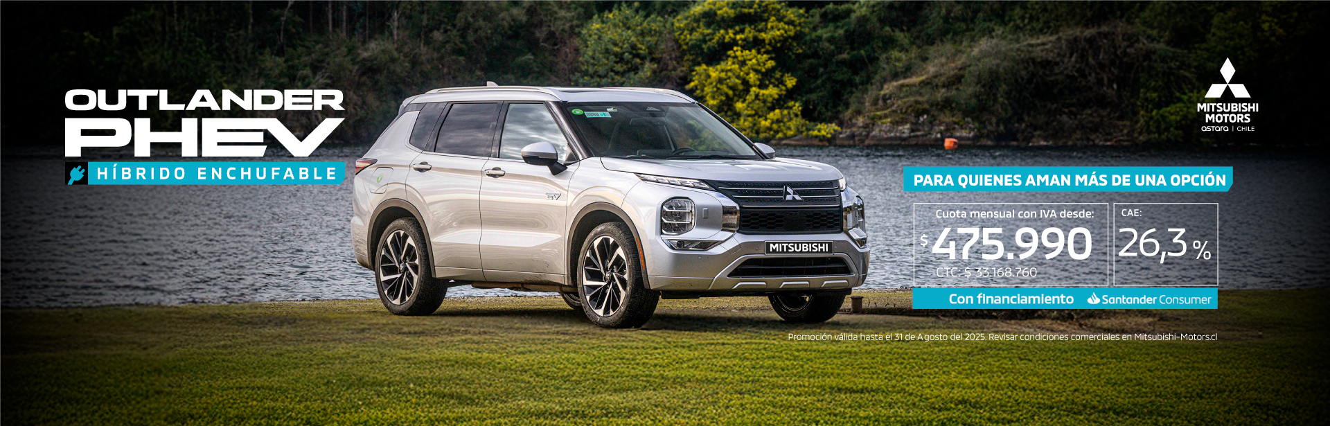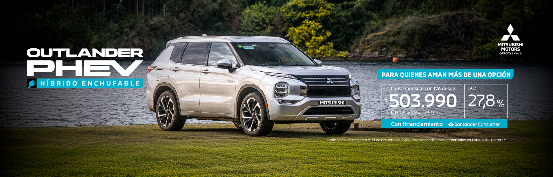 “Campaña Mitsubishi New OUTLANDER CI 50/50 tasa 1.99 noviembre 2025” válida por compras realizadas entre el 01 y el 30 de noviembre de 2025 y financiadas mediante crédito otorgado por Santander Consumer Finance Ltda. Precio corresponde a Modelo NEW OUTLANDER PHEV 4X4 AT GLS Precio sin bono: $44.990.000. Precio $43.490.000 incluye bono marca y bono financiamiento Santander Consumer. Condiciones de Financiamiento: Pie del 50% y plazo de 25 meses, con producto Black 50/50 Santander Consumer, línea Silver, VFMG (Cuota 25 de 50% del valor del vehículo) Ejemplo Simulación: modelo NEW OUTLANDER PHEV 4X4 AT GLS Precio con bono $43.490.000, Pie $21.745.000, CAE 27,8% CTC de $33.840.760, 24 cuotas de $503.990 más un VFMG (Cuota 25) de $21.745.000. Valores incluyen gastos operacionales y seguro de desgravamen, los seguros son optativos.
