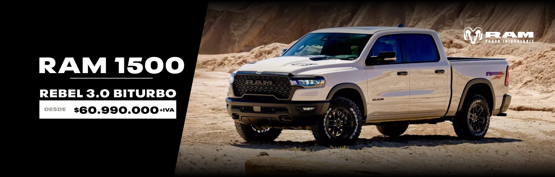 Precios válidos por compras realizadas desde el 01 al 30 de septiembre 2025 y financiadas por Santander Consumer Finance Ltda. o hasta agotar stock de 40 unidades. Precio corresponde a modelo RAM 1500 REBEL 3.0 BITURBO. Precio lista: $63.990.000 + IVA. Precio $57.990.000 + IVA incluye bonos. Incluye bono todo medio de pago de $4.000.000 + IVA y bono con financiamiento Santander Consumer C.I. de $2.000.000 + IVA. Condiciones de Financiamiento: Producto Compra Inteligente línea normal con pie máximo de 50% a plazos de 24 y 36 meses más VFMG (Cuota mes 25 y 37 respectivamente). Valores no incluyen seguros que son optativos Crédito sujeto a aprobación, previa evaluación de antecedentes comerciales conforme a las políticas de Santander Consumer Finance Ltda. Precio excluye Zona Franca y no incluye flete a regiones
